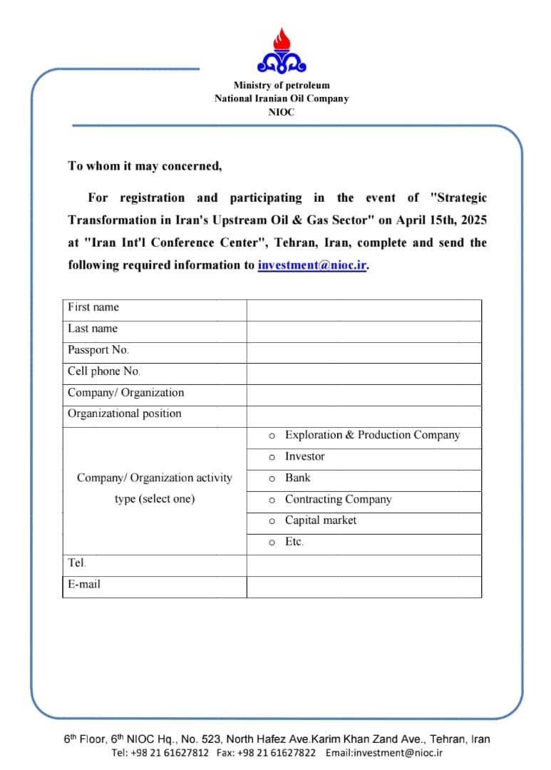 La conférence sur les opportunités d'investissement dans le secteur pétrolier et gazier iranien, en présence des meilleurs experts et des entreprises actives dans ce secteur, se tiendra le 15 avril 2025 au "Centre international de conférences d'Iran".Pour vous inscrire, veuillez envoyer vos informations à l'adresse électronique suivante : investment@nioc.ir